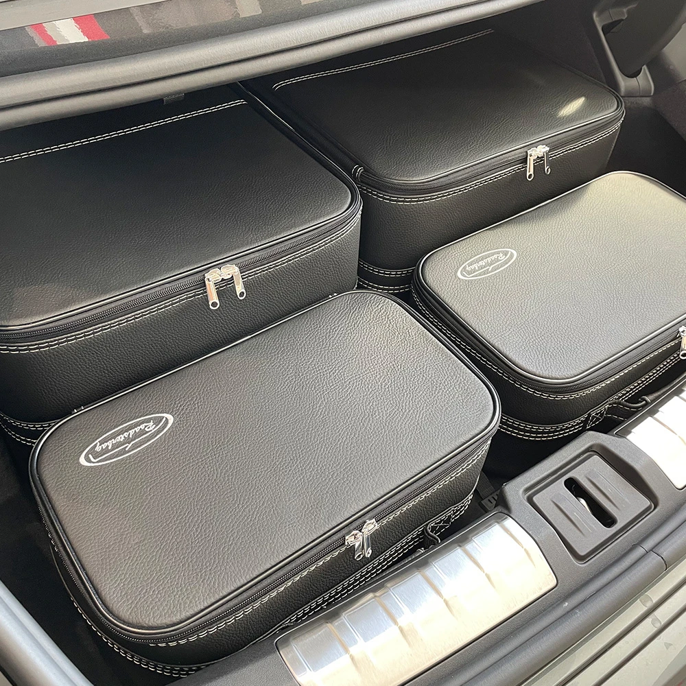 Dieses vierteilige Kofferset ist die ideale Wahl, wenn Sie mit Ihrem Audi GT E-Tron gerne Ausflüge mit großem Gepäck unternehmen. Die vier praktischen Koffer passen durch ihr Design perfekt in den Kofferraum Ihres Wagens. Hergestellt aus Markenkunstleder mit einem hochwertigen Innenfutter aus Ancarra®-Mikrofaser und luxuriöser Stickerei sind diese Gepäckstücke optisch absolut gelungen. Ein innovativer Metall-Kunststoff-Verbundrahmen sorgt für die nötige Stabilität. Dank bequemer Tragegriffe und modernem Trolleygestänge lassen sich die Koffer komfortabel transportieren. Die Trolleys wurden so entworfen, dass man das Ladekabelfach unter dem Ladeboden einfach erreichen kann. Die Taschen können oben auf die Trolleys aufgesteckt werden.