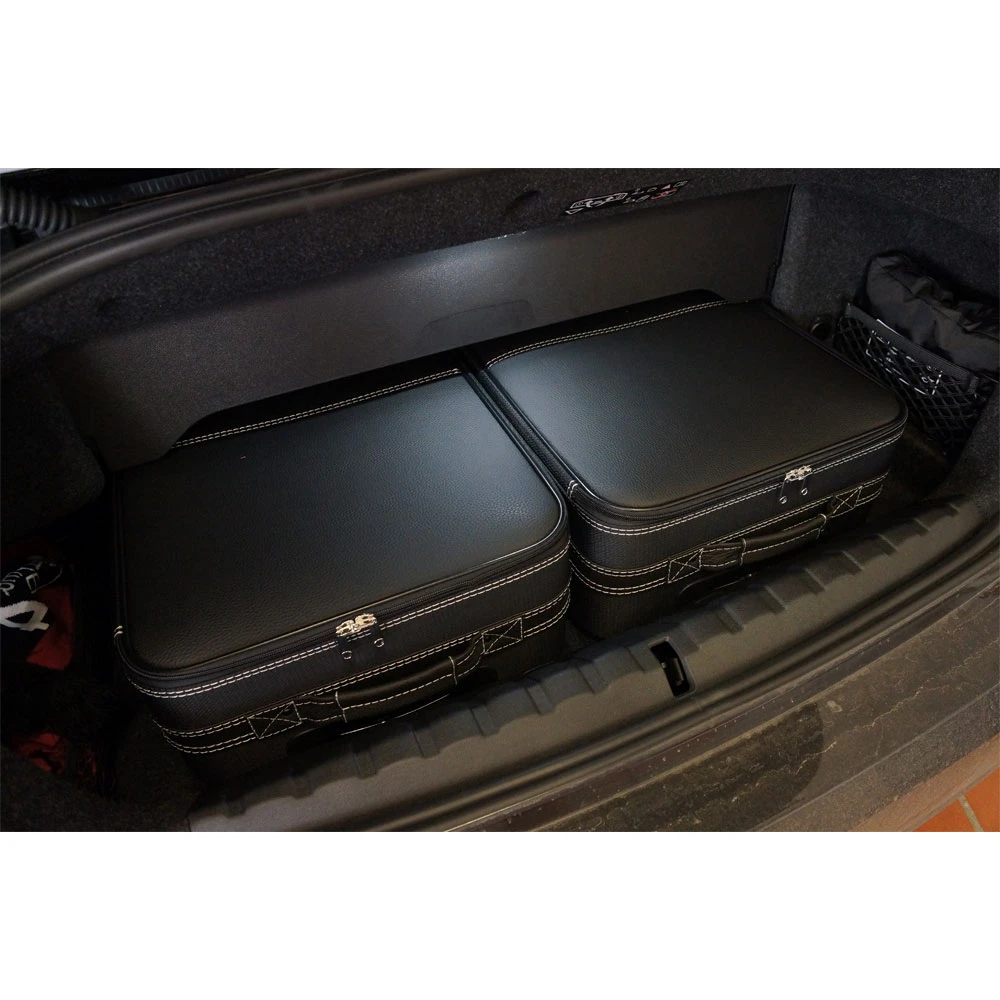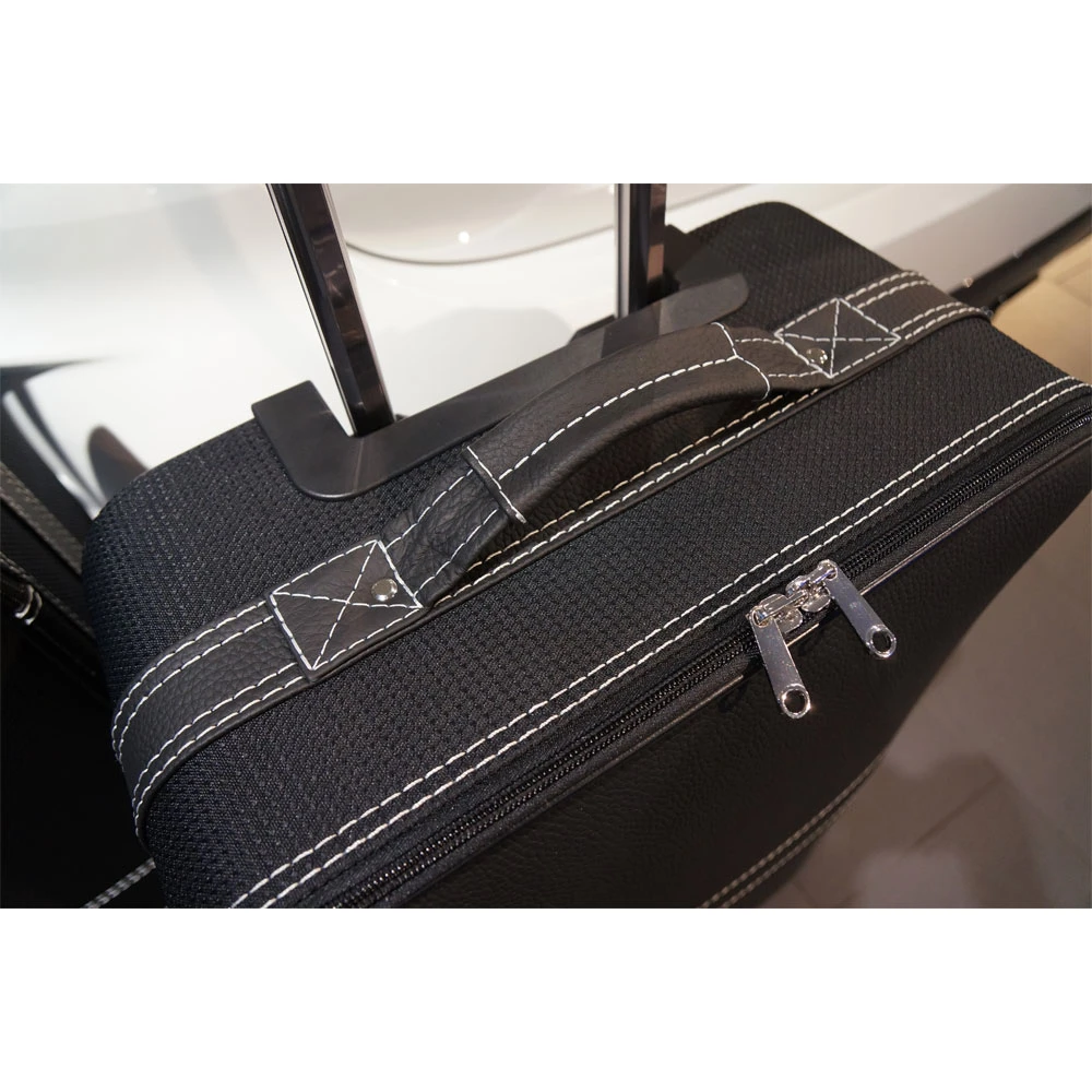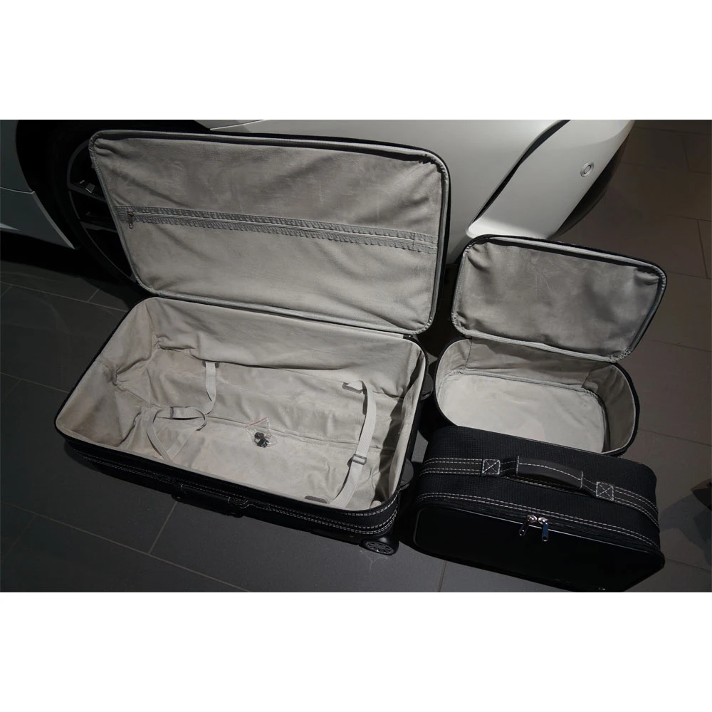 Dieses 4-teilige Kofferset wurde speziell für das BMW 4er Cabrio G23 entwickelt und passt exakt in den Kofferraum, ohne Platz zu verschwenden. So können Sie immer mit maximalem Gepäck auch bei offenem Verdeck auf Tour gehen. Die Koffer verfügen über einen abschließbaren Deckel mit Innenfach (mit Reißverschluss) und Spannbänder für die Fixierung des Kofferinhaltes, damit bei der Reise nichts verrutscht. Die Trolleys verfügen über einen voll versenkbarem Griff und kugelgelagerte, verchromten Felgen mit extrabreiten Reifen und lassen sich so im vollen Zustand einfach fortbewegen. Der Leichtbau-Rahmen der Koffer sorgt für Stabilität und leichte Handhabung, das gestickte Logo, wählbare farbige Nähte und feines Innenfutter aus Ancarra®-Mikrofaser verleihen dem Set eine edle Optik.