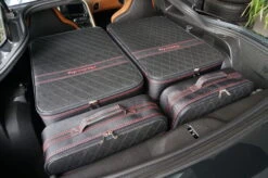 Dieses 4-teilige Kofferset wurde speziell für das BMW 6er Cabrio E64 entwickelt und passt exakt in den Kofferraum, ohne Platz zu verschwenden. So können Sie immer mit maximalem Gepäck auch bei offenem Verdeck auf Tour gehen. Die Koffer verfügen über einen abschließbaren Deckel mit Innenfach (mit Reißverschluss) und Spannbänder für die Fixierung des Kofferinhaltes, damit bei der Reise nichts verrutscht. Die Trolleys verfügen über einen voll versenkbarem Griff und kugelgelagerte, verchromten Felgen mit extrabreiten Reifen und lassen sich so im vollen Zustand einfach fortbewegen. Der Leichtbau-Rahmen der Koffer sorgt für Stabilität und leichte Handhabung, das gestickte Logo, wählbare farbige Nähte und feines Innenfutter aus Ancarra®-Mikrofaser verleihen dem Set eine edle Optik.
