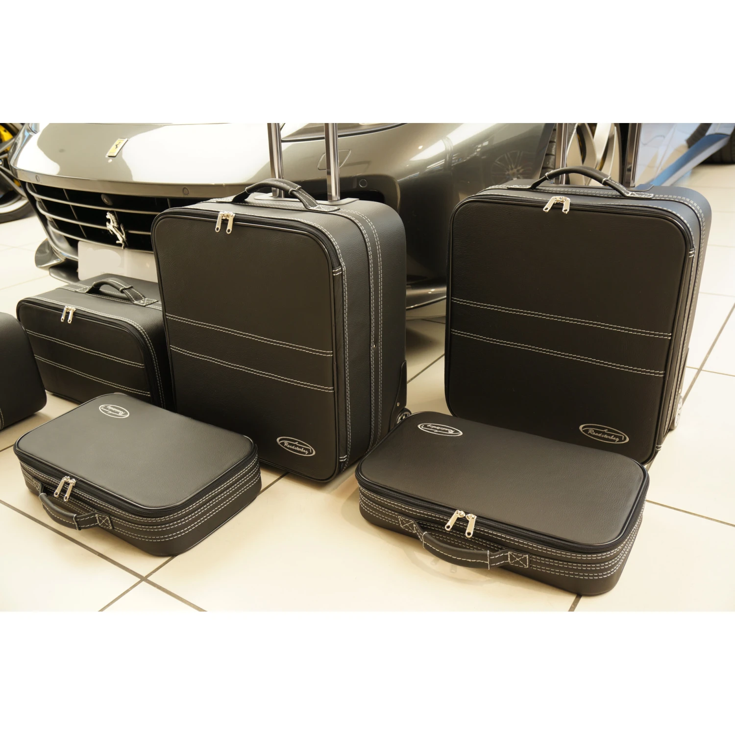 Dieses sechsteilige Kofferset von Roadsterbag ist speziell auf den Kofferraum des Ferrari GTC4Lusso und des Ferrari FF zugeschnitten. Die Trolleys und die passenden Koffer nutzen den vorhandenen Stauraum optimal aus. Die Trolleys sind mit voll versenkbarem Griff, silikongedämpften, verchromten Laufrollen, Kugellagerung und Inside-Trolley-Technik aus leichtem Aluminium ausgestattet. Die erstklassige Verarbeitung und das hochwertige Innenfutter aus edler Ancarra-Mikrofaser verleihen dem Set eine edle Optik, die sich nahtlos in das Innendesign Ihres Wagens einfügt. Dank bequemer Tragegriffe lassen sich die Gepäckstücke komfortabel transportieren.
