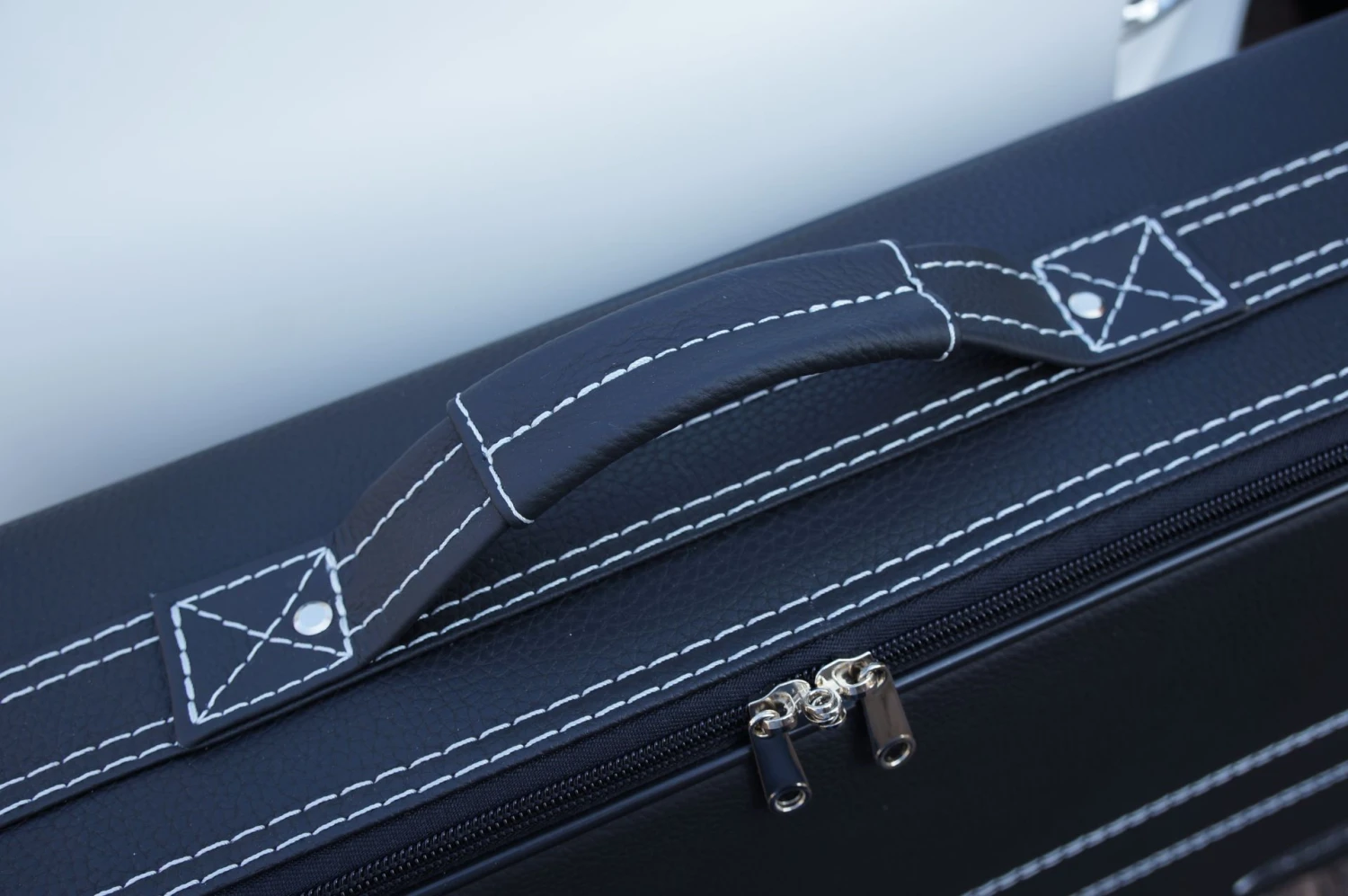 Die drei Koffer dieses hochwertigen Sets von Roadsterbag passen perfekt in den vorderen Kofferraum ihres Porsche Boxsters (986+987). Roadsterbag setzt auf hochwertige Materialien und erstklassige Verarbeitung. Die Front sowie die Griffe der Koffer sind aus Echtleder, alle anderen Flächen aus strapazierfähigem Kunstleder. Die silbergrauen Kontrastnähte wirken besonders edel auf den schwarzen Koffern. Das Innenfutter der Koffer ist aus Ancarra Mikrofaservlies, welches mit dem Roadsterbag-Logo versehen ist.