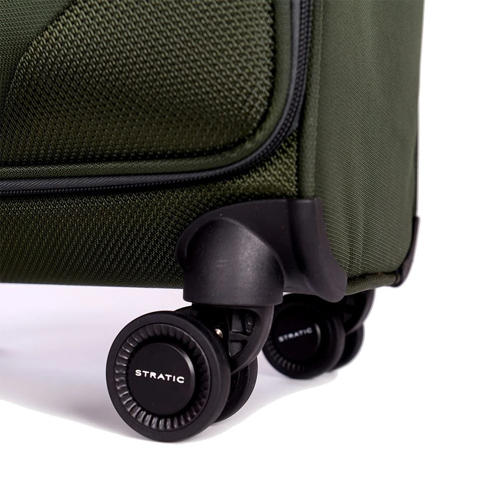 Die Serie Mix ist der neueste Überflieger bei Stratic und überzeugt durch schlichtes Design aus hochwertigem Nylon. Das Frontfach ist mit 1-Wege- Sicherheitsreißverschlüssen versehen. Das geräumige Hauptfach ist mit einem knitterfreien Satin Stoff ausgestattet und besitzt einen 2-Wege-Sicherheitsreißverschluss für komfortables Packen. Im Inneren befinden sich ein Reißverschluss-Hauptfach mit hoch belastbaren Kreuzspanngurten. Ein Kugelgelagertes Leichtlauf-Doppelrollensystem und ein ergonomisch geformter Griff an einem arretierbaren Teleskopgestänge lassen den Koffer extrem leicht fahren und bepackt wendig manövrieren. Die Ausstattung mit einem TSA Schloss für die Reisen in die USA und GB ist selbstverständlich.